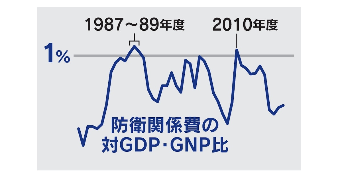 日本の防衛費は1976年に当時の三木内閣が、国民総生産(GNP)比で1%以内にすると閣議決定した。87年に中曽根内閣が枠を廃止し、87~89年度の防衛予算はGNPの1%を超えた。