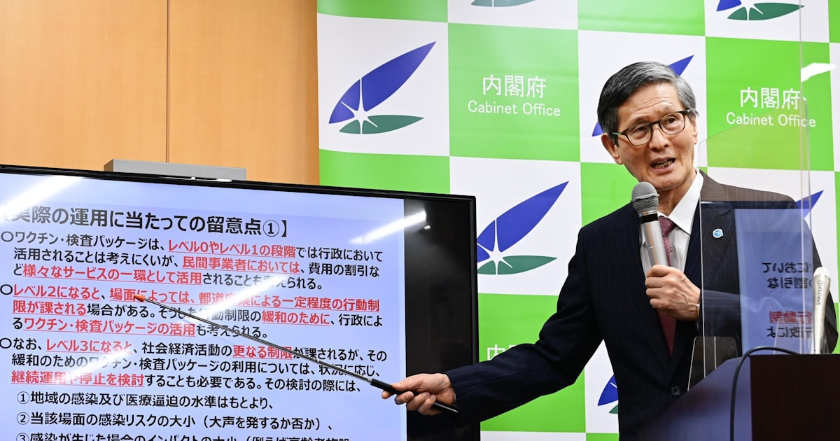 政府は16日午前、イベント参加や飲食店を利用する際にワクチンの接種証明書や感染検査の陰性証明書を提示すれば人数制限などを緩和する「ワクチン・検査パッケージ」の概要を専門家に示した。接種証明書は有効期限を当面設けず、証明書の画像やコピーの利用も可能にする。