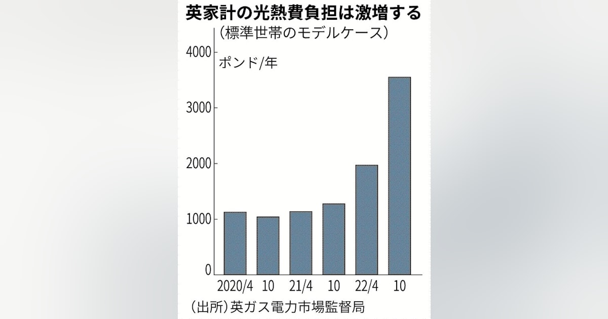 2022年8月27日 英国のエネルギー規制当局は26日、家庭の電気・ガス料金水準の大幅な引き上げを発表した。年間の光熱費は標準世帯のモデルケースで10月から3549ポンド(約57万円)と、現在の1971ポンドから80%高まる。(日経)