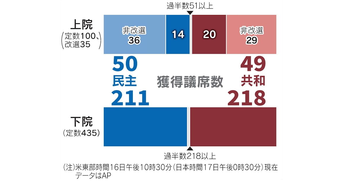 米主要メディアが報じた。上院は与党・民主党が多数派を維持するのが確実で、上院と下院で多数派が異なる「ねじれ議会」になる。バイデン政権は難しい政権運営を迫られる。
